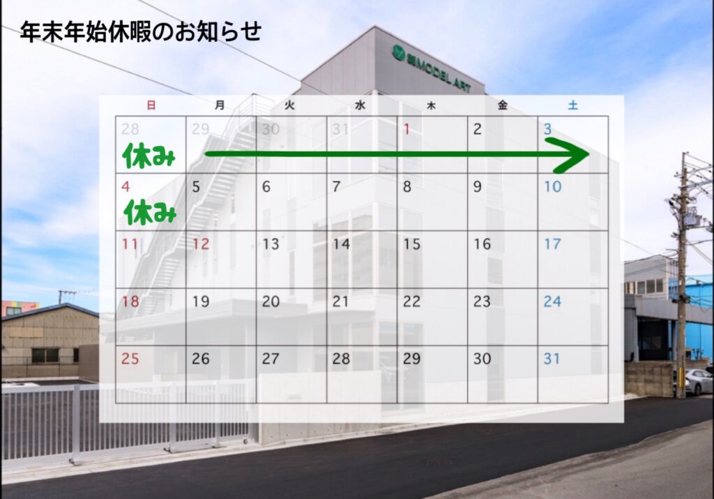 年末年始休暇のお知らせ 2025年12月22日 最終更新日時 : 2025年12月22日 kanri 何卒よろしくお願い致します。 12月28日(日)~1月4日(日)の期間は 休業させていただきます。 休業期間中に頂いたお問い合わせに つきましては1月5日(月)より 順次対応させて頂きます。 何卒よろしくお願い致します。